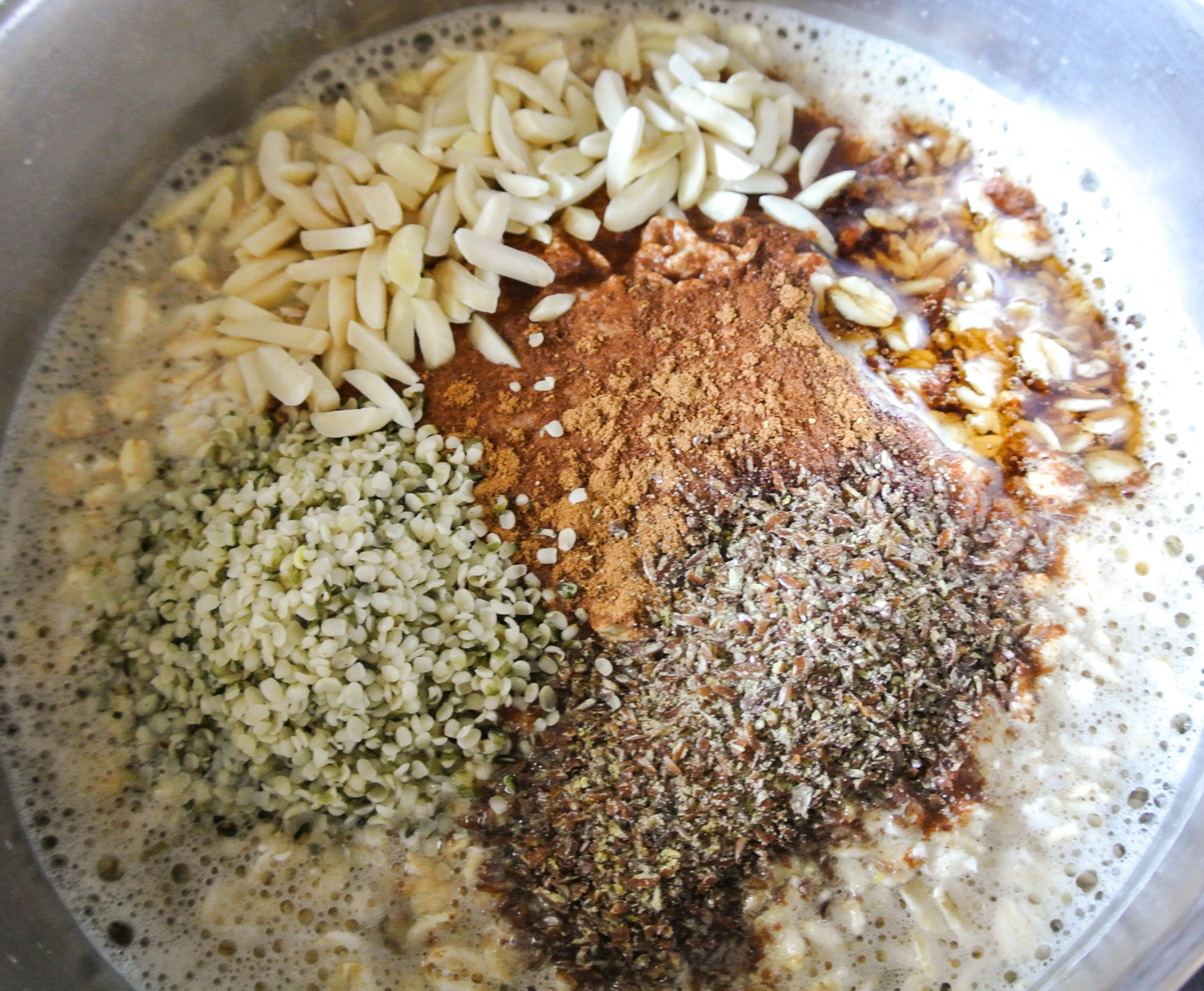 - ½ cup specialty ingredients + extra for garnishing (finely chopped raw fruit, dried fruit, raw nuts, raw seeds, etc.) –> I’m using ¼ cup each hemp and ground flax seeds.