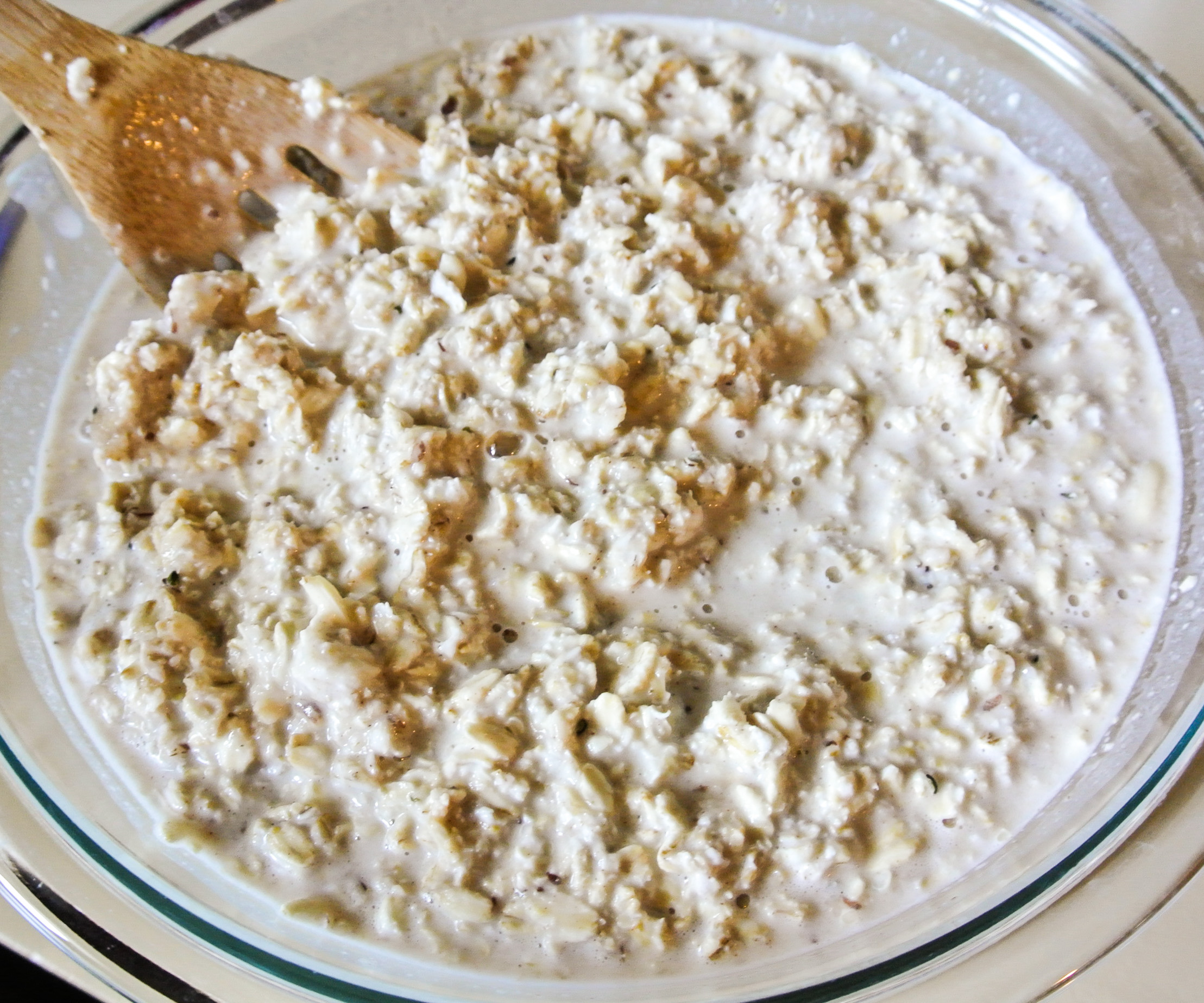 Place your oats in a large glass bowl with a lid. Stir in all ingredients and fill the bowl with liquid enough to cover the mixture by about half an inch.