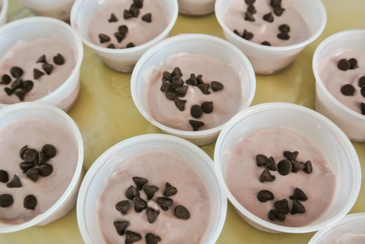 If using, put all of the ingredients into a food processor. Pulse until well-combined, but sticky. Press into your individual serving vessels of choice. I originally planned to make these in a mini-muffin pan and pop them out frozen to thaw, thus why you see them that way here. Later, when I realized that the mousse would not maintain a mini-pie shape after being popped out of the pan, I transferred each mousse to an individual plastic cup, which is where I would have started my crust to begin with, had I known what was going to happen. 🙂 Place crusts in the freezer to firm up.