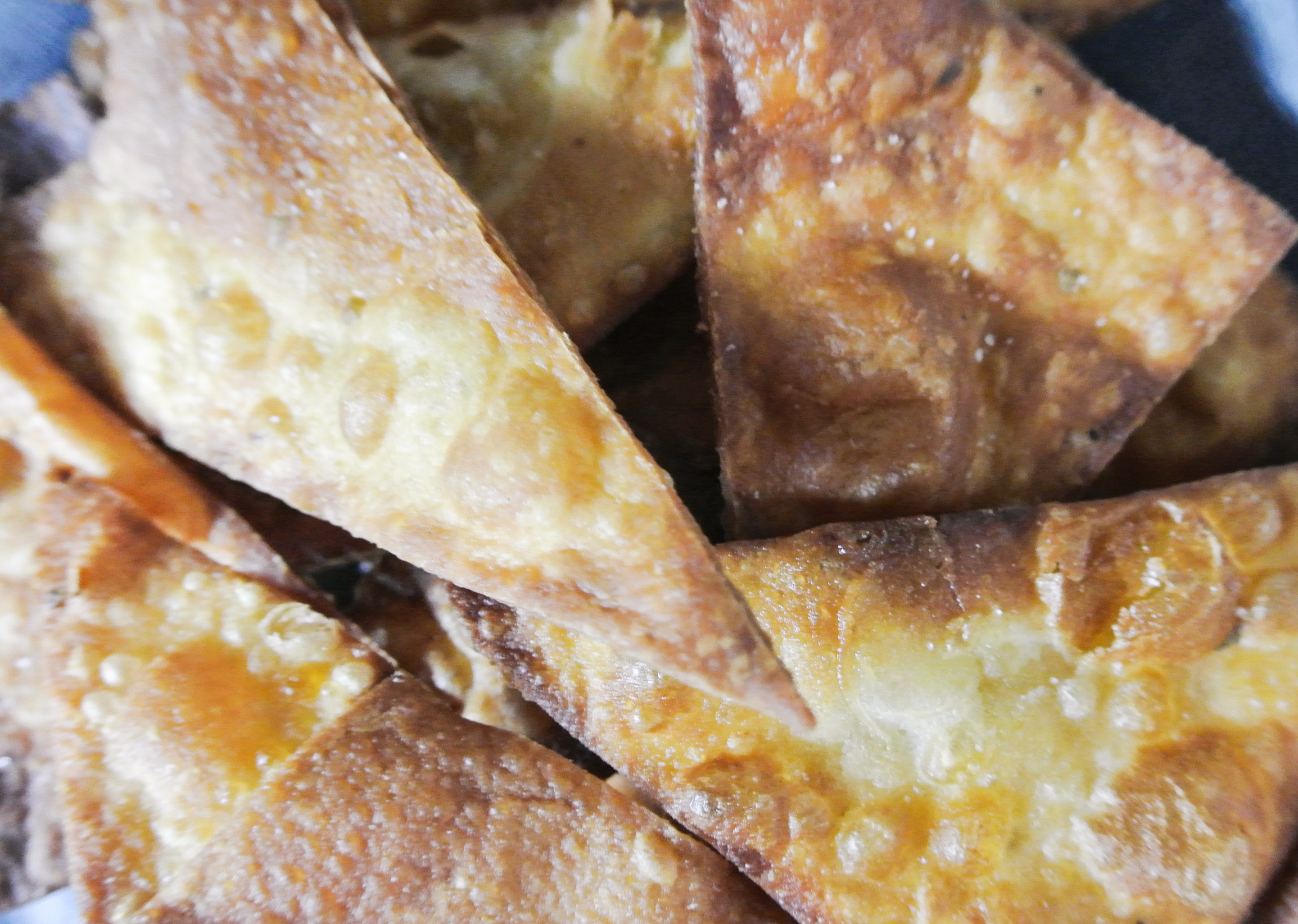 I figure that if I’m going to eat something fried, I’d like to control the quality. Travis and I use peanut oil, which is among the oils tolerant to high cooking temperatures. I finish them with a light dusting of pink Himalayan sea salt. One large tortilla makes ten to fifteen chips, depending on how you cut it.