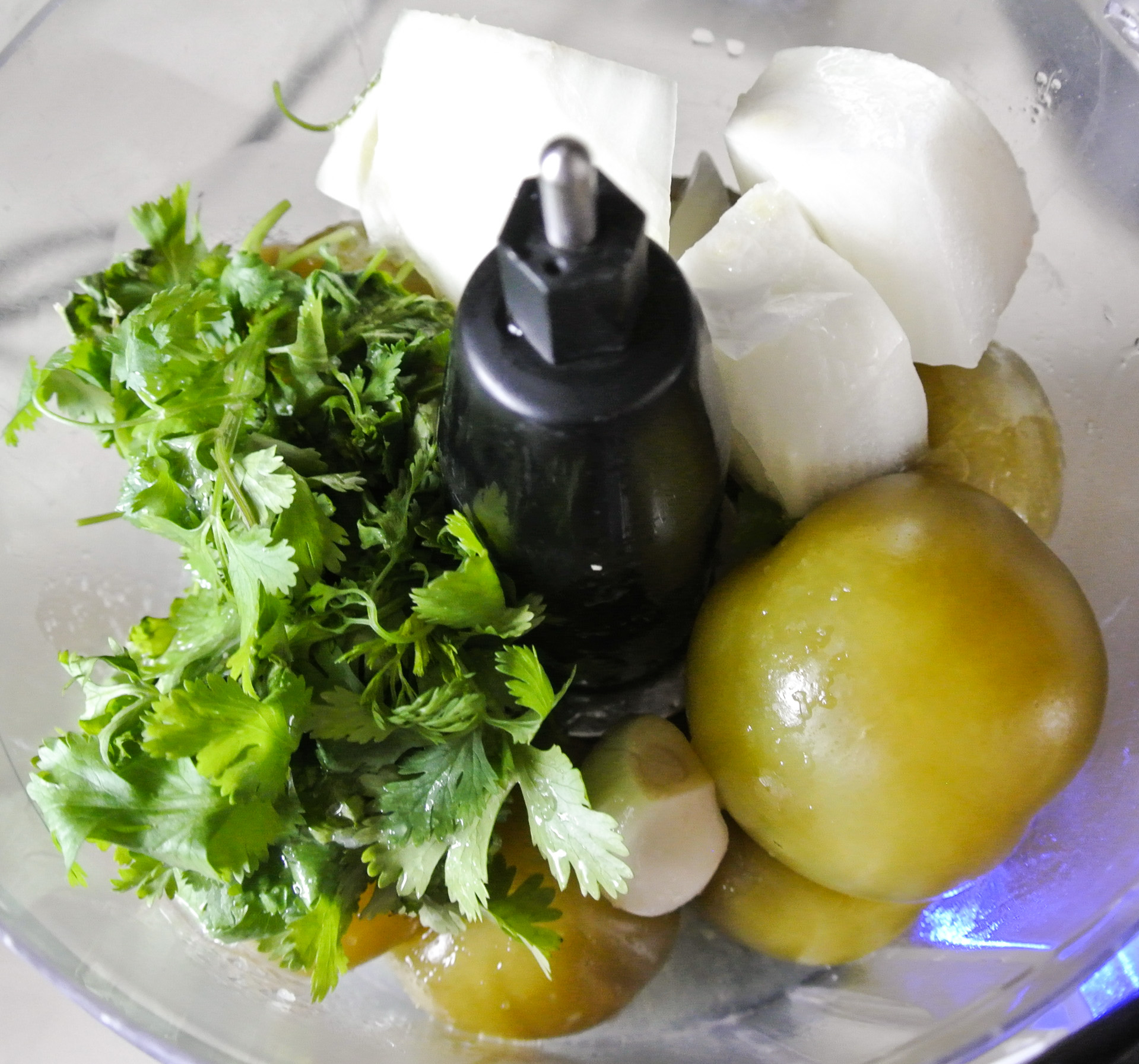Coarsely chunk your onion and any other vegetables (optional) that you’re adding to your salsa. Place all ingredients–including the soft, whole, cooked tomatillos–into a food processor and pulse or puree until desired consistency is achieved. Chill before serving and store in the fridge for a few days.